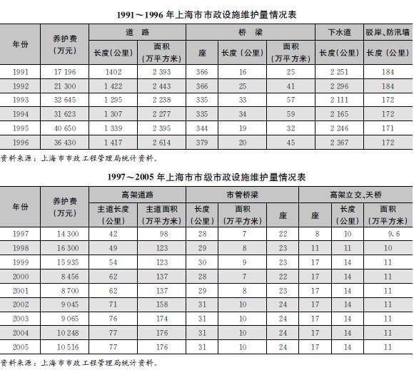 为促进上海城市发展,改善城市硬件设施和投资环境,在1991~2005年的15年间,随着越江桥梁、隧道、高架道路的投入使用,市政维护保养工程量和维护资金需求不断增加,市、区两级政府加大对市政维护资金投入,累计支出28.24亿元,改善城市路况,加强对高架道路、市中心道路及主要道路的维护和保养,提高其完好率。