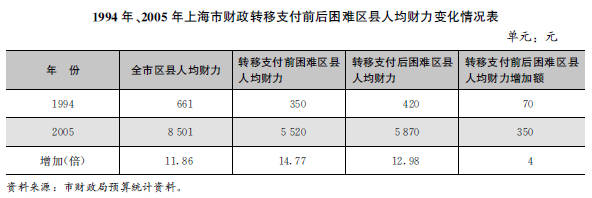2005年市对困难区县实施财政转移支付后,人均财力达到5870元比1994年的420元增加12.98倍。
