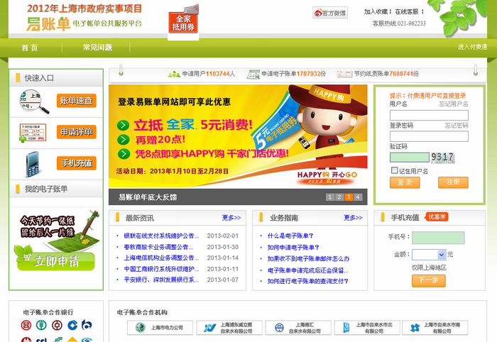 根据《上海市推进智慧城市建设2011-2013年行动计划》,2012年市级财政安排专项资金支持本市电子账单公共服务平台建设。通过互联网、移动终端等多种渠道,为市民提供公用事业账单的申请、推送、查询、支付和管理“一站式”服务,鼓励市民使用电子账单替代纸质账单。