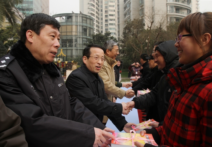 市领导向居民代表赠阅《上海市家庭消防安全知识读本》。)