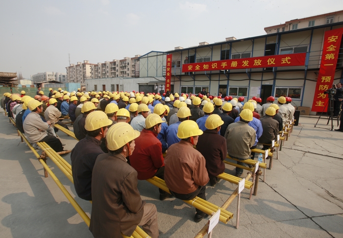 (图为农民工安全生产培训某工地《安全知识手册》发放仪式。)