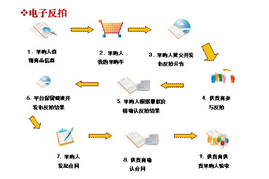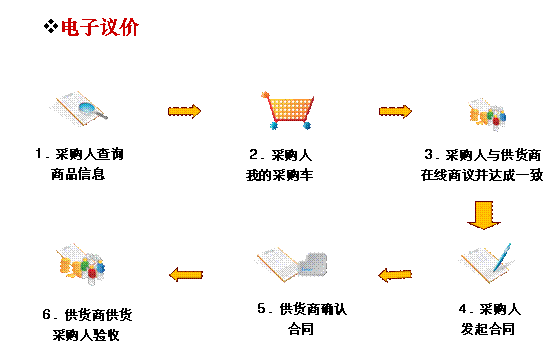 电子集市目前有直接选购、电子议价、电子反拍、电子团购四种交易方式。其中,采购人采购定点采购产品时实行直接选购,即由采购人在电子集市中与选择的供货商直接签订合同、完成采购;采购人采购协议供货产品时,必须在电子集市中通过电子议价、电子反拍、电子团购三种竞价手段之一与供货商作进一步竞价,以更低的价格完成采购。