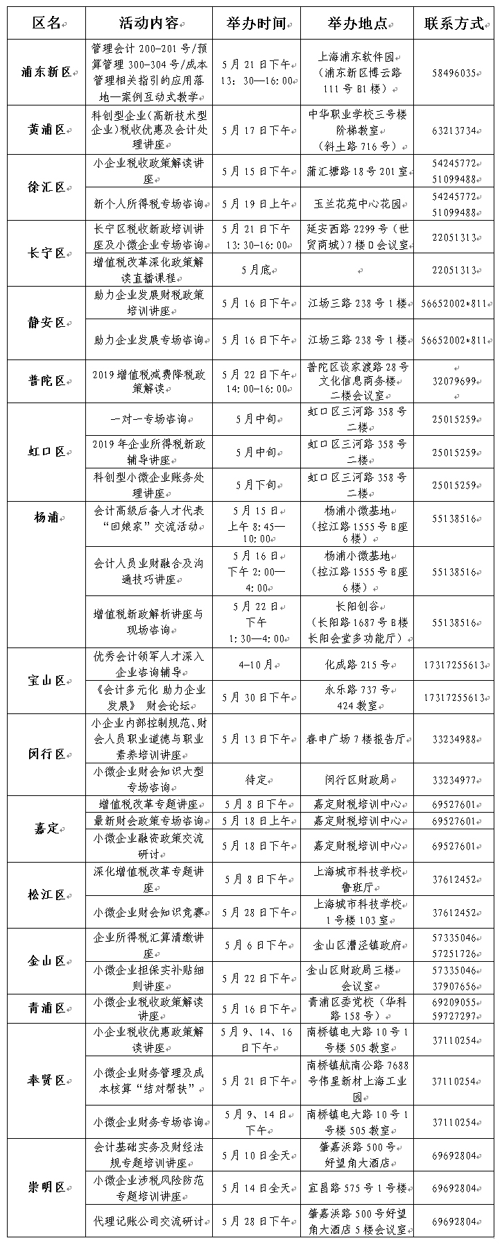 “2019年上海市小微企业财会服务月”各区小微基地活动安排